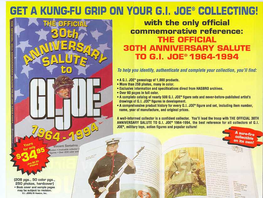 ![]() | The Official 30th Anniversary Salute to G.I. Joe 1964-1994 | Vincent Santelmo | 0873413016 | This is a great book with many sharp black and white as well as some color photos. It covers the whole history of Joe, from vintage, through the 3 3/4" years and finally Hall of Fame. I personally think they wasted all the color photos on the HOF when they should have used them for the vintage shots. |